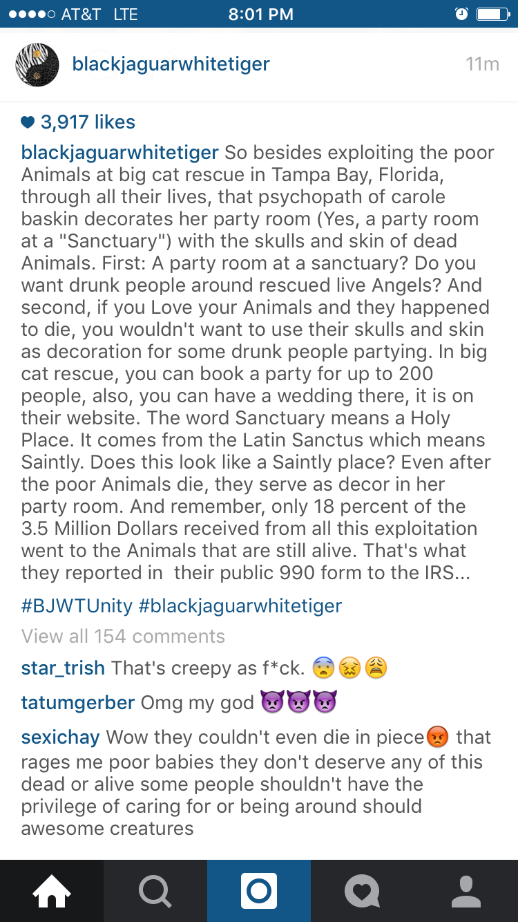 However, when your foundation takes “donations” in exchange for the chance to play with your captive wild animals, gaining the status of 501(c)(3) status via the efforts of an entrainment accounting company, and a CFP who specializes in getting tax exemption for companies, and then happily announcing on your Instagram that now all of those “donations” people pay you in order to play with your animals are ALSO tax free for them, does not, in fact, validate you as a conservation group. If anything, it only casts a longer shadows over your empire of pseudo conservation.